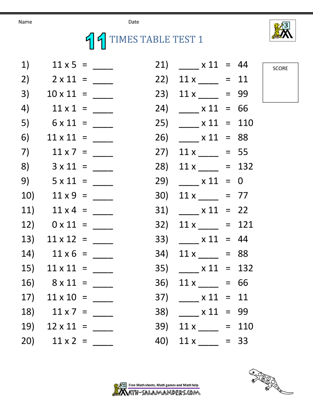 11 Times Tables Worksheets