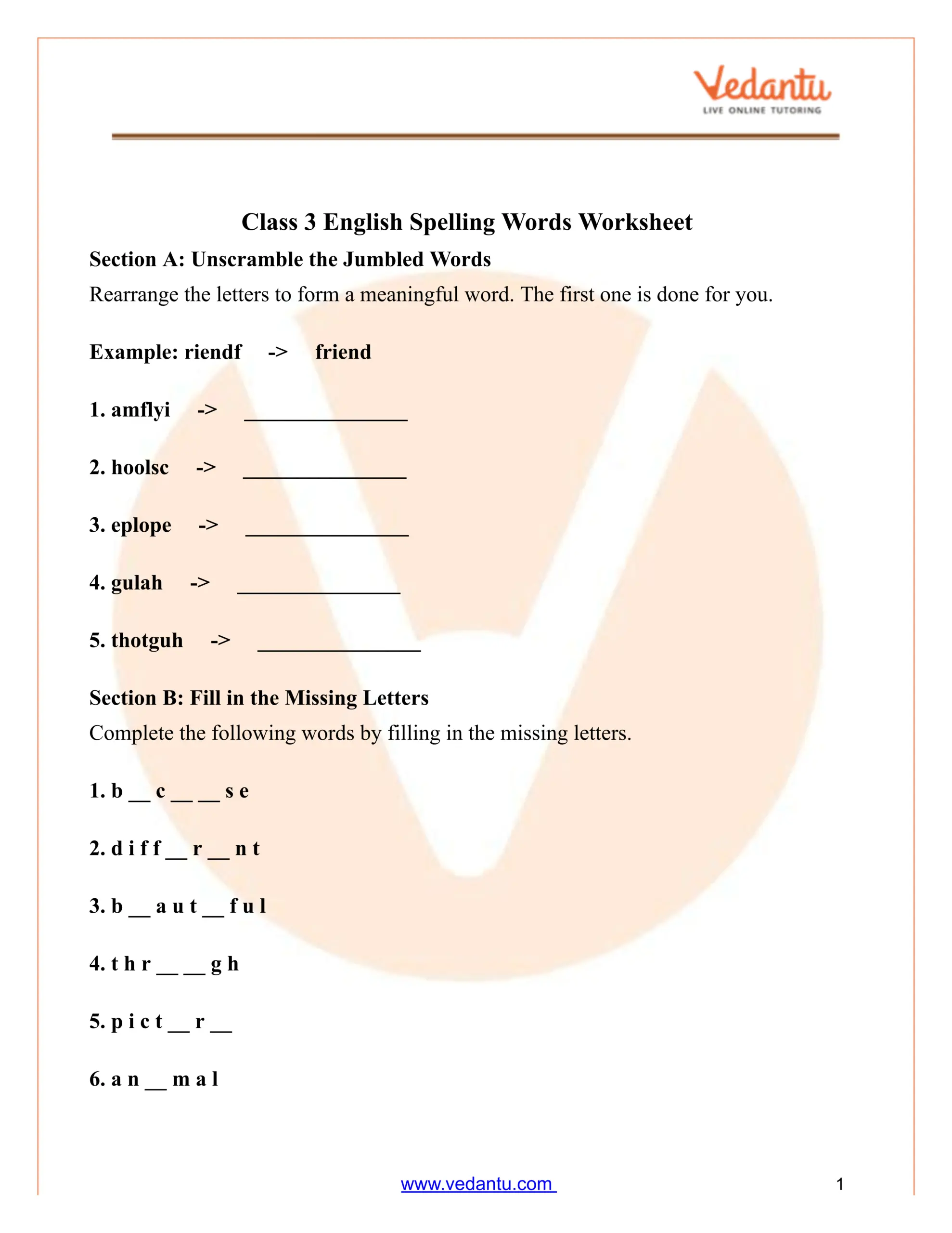 Class 3 Spelling Words Worksheet PDF With Answers