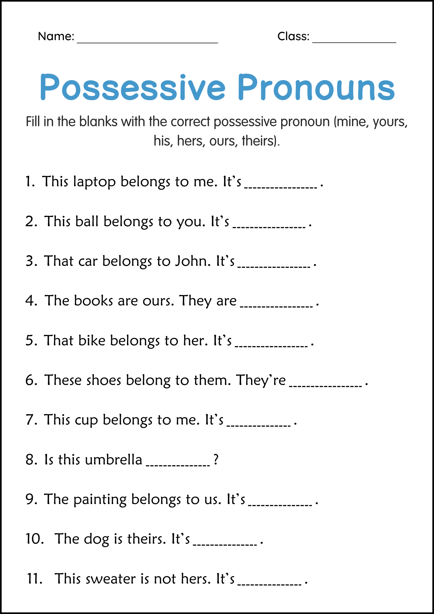 Possessive Pronouns Grammar Activity Worksheets For Grade 2 3 4 Made By Teachers