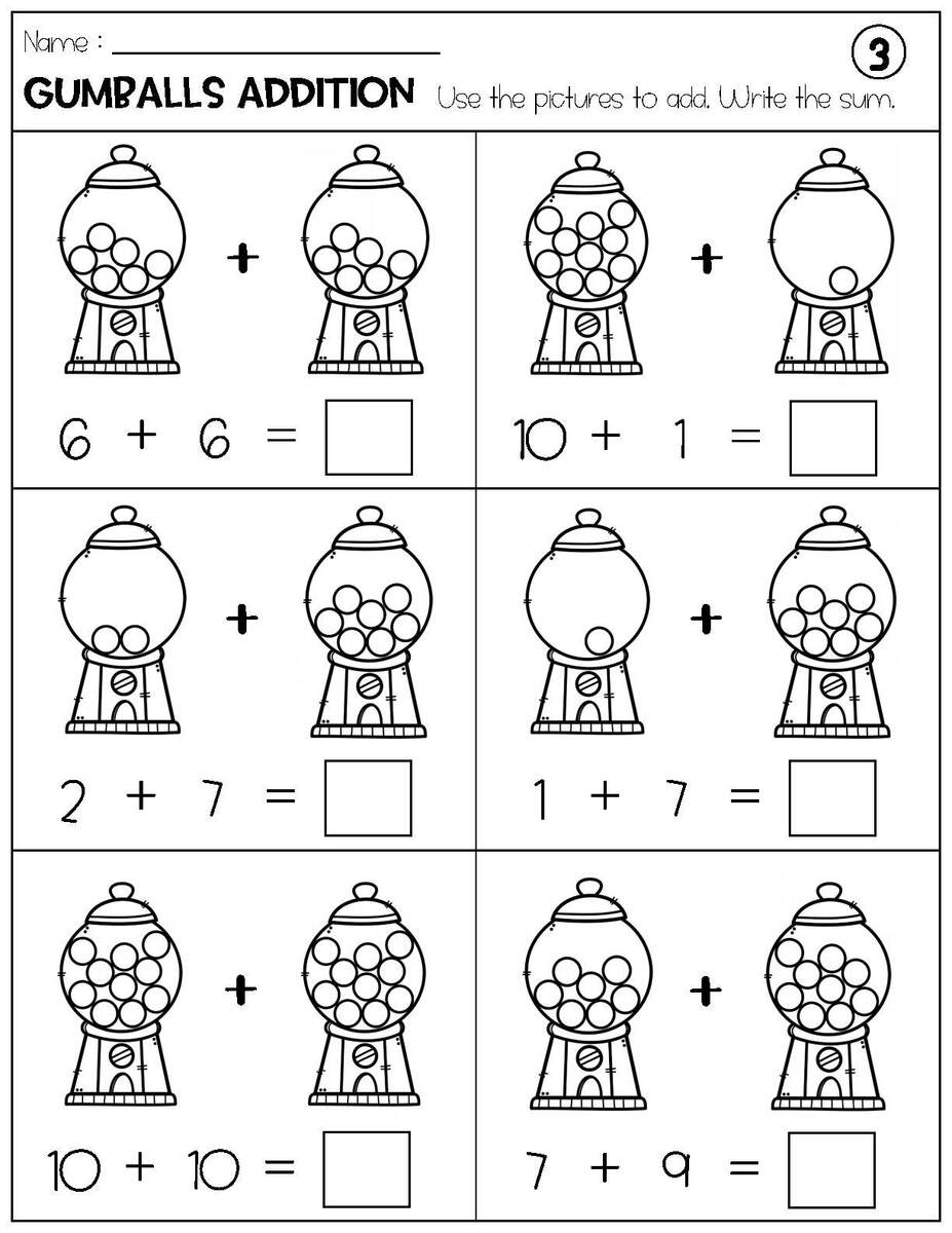 Addition With Pictures Sum Up To 20 Worksheets Adding Gumballs Pictures Math Worksheets Printable Etsy