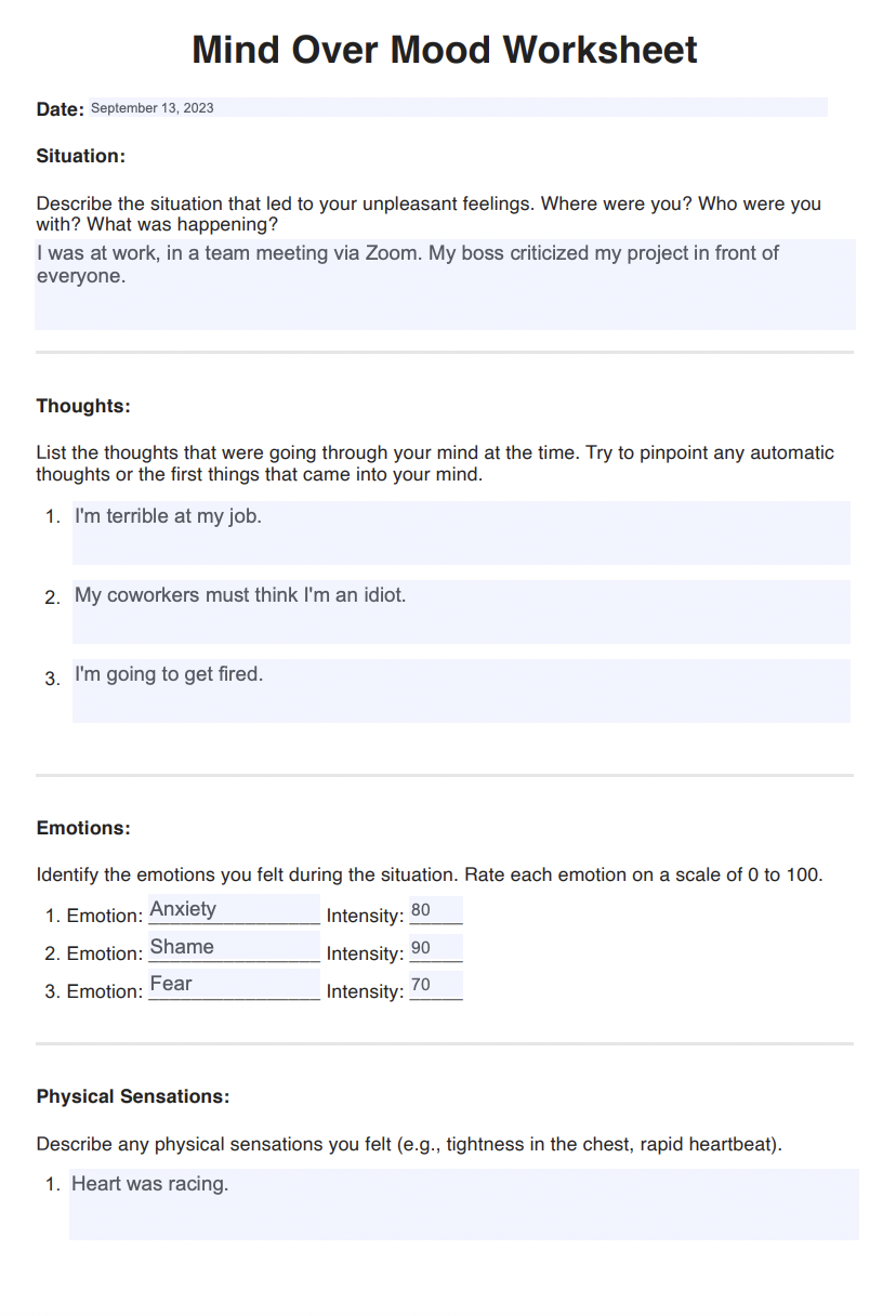 Mind Over Mood printable worksheets are a type of cognitive-behavioral therapy (CBT) worksheet that helps individuals identify and challenge negative thought patterns. They typically consist of a series of questions and prompts that guide the individual through the process of identifying their thoughts, emotions, and behaviors. The worksheets may also include exercises and activities designed to help individuals develop more balanced and constructive ways of thinking. By using these worksheets, individuals can gain a greater understanding of their emotions and develop the skills they need to manage them more effectively.