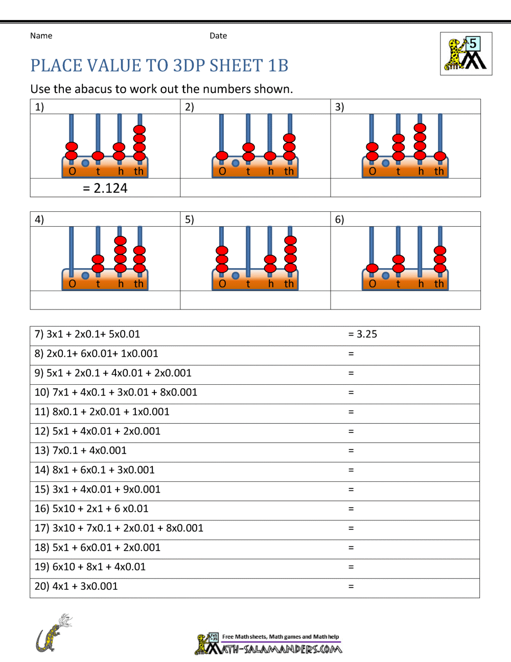 Decimal Place Value Tenths Hundredths And Thousandths Worksheet Printable PDF Year 5 Number Worksheet