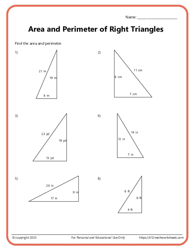 Using printable area and perimeter of triangles worksheets offers numerous benefits for students. These worksheets provide a structured and organized way of learning, allowing students to practice and reinforce their understanding of geometry concepts. Additionally, worksheets can be tailored to meet the needs of individual students, making them an excellent resource for teachers and parents. With printable worksheets, students can learn at their own pace and develop a strong foundation in math.